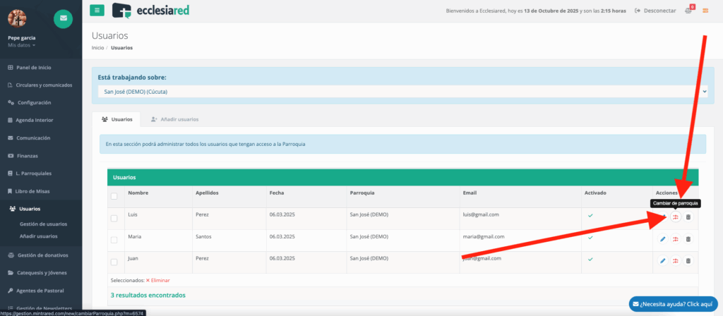 En ese caso, y en el caso de que nosotros seamos el párroco que sale de la parroquia, deberemos siempre pedir a nuestra Diócesis que realice el cambio. La Diócesis, desde el usuario diocesano, puede cambiar a ese usuario la parroquia que tiene asociada. Para ello, lo único que deberá hacer la Curia es acudir a la pestaña “Usuarios” y seleccionar en el selector superior la parroquia donde se encuentra el usuario en cuestión.
