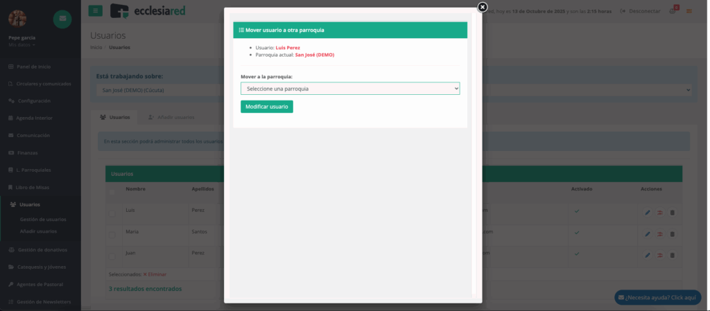 Como vemos en la imagen anterior, el último paso es seleccionar a qué parroquia cambia este usuario. Una vez marquemos la parroquia a la que va, deberemos apretar a modificar usuario y listo, habremos cambiado la parroquia asignada a ese usuario fácilmente.